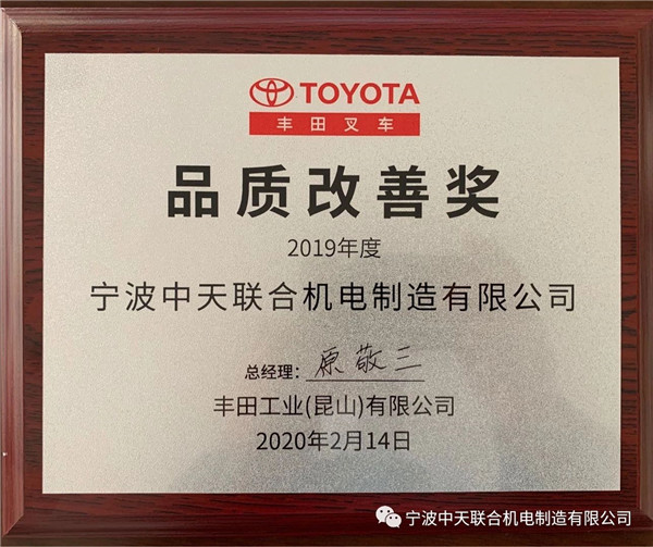 寧波中天聯(lián)合機(jī)電喜獲豐田叉車2019年品質(zhì)改善獎(jiǎng)
